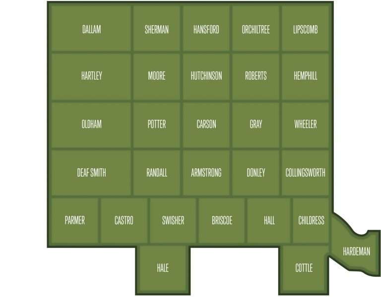 Counties in our 30,000 square mile service area include Armstrong, Briscoe, Carson, Castro, Childress, Collingsworth, Cottle, Dallam, Deaf Smith, Donley, Gray, Hale, Hall, Hansford, Hardeman, Hartley, Hemphill, Hutchinson, Lipscomb, Moore, Ochiltree, Oldham, Parmer, Potter, Randall, Roberts, Sherman, Swisher, and Wheeler.